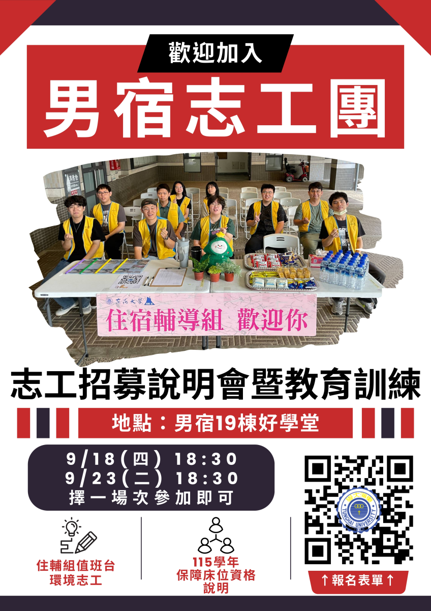 【志工】114學年一教宿舍志工招募資訊
