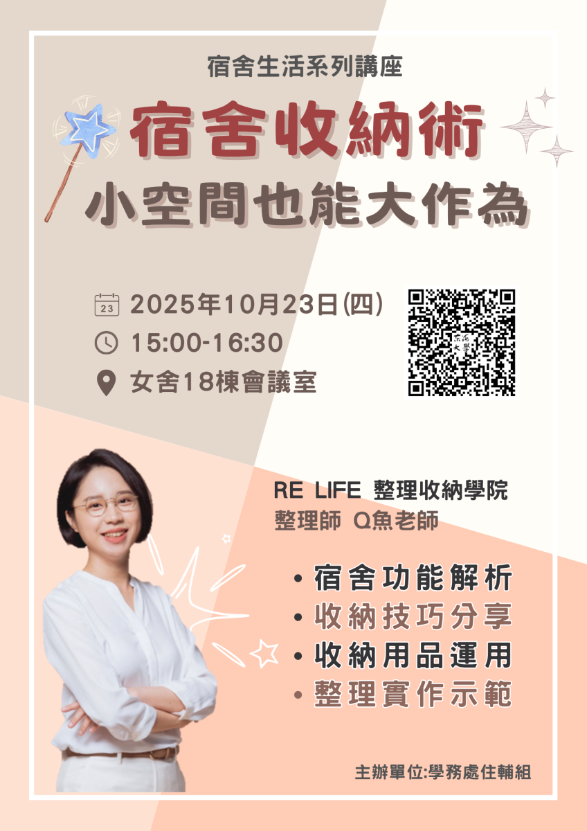 宿舍生活系列講座|住宿學習 × 手作 × chill生活 從日常出發,學會照顧自己、享受住宿生活 ➜參與三場講座,可獲得上課證明及小點心一份 【場次一】宿舍收納術-小空間也能大作為 講師:戴瑜嫻整理師(Q魚老師) 時間:10月23日(星期四) 15:00 地點:女舍18棟會議室 報名連結:https://tevent.thu.edu.tw/tEvent_front/tEvent.php?type=0&conference_code=2025100029
